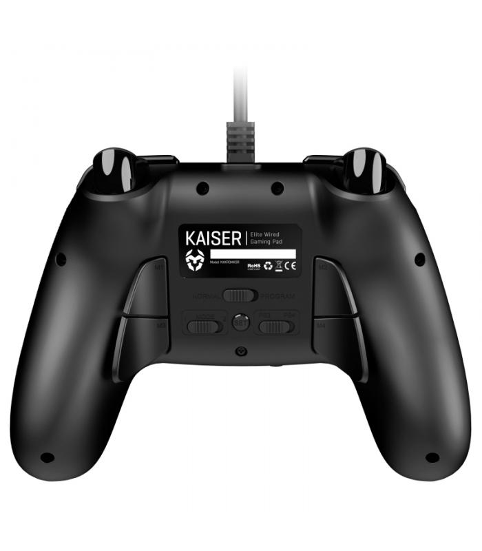 Kaiser es un mando multiplataforma de fácil personalización, posee 12 botones y 4 palancas traseras que pueden configurarse para replicar cualquiera de los otros 8 botones de manera sencilla e intuitiva y que te permite guardar hasta 2 perfiles.