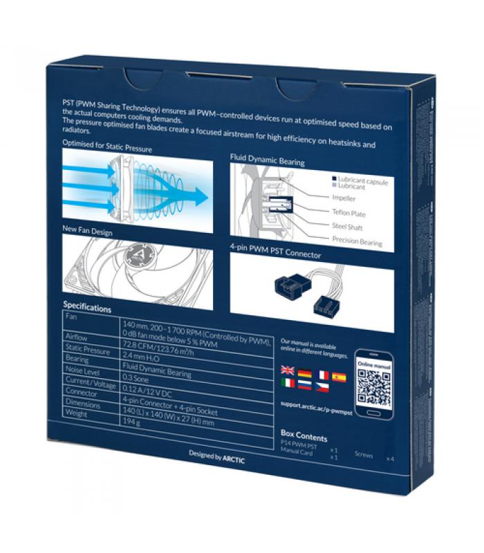 Gracias a su amplio rango de regulación y a la tecnología PWM Sharing (PST), la velocidad del ventilador P14 PWM PST se puede controlar simultáneamente con la de todos los demás ventiladores. Esto minimiza el ruido y garantiza el máximo rendimiento de refrigeración cuando sea necesario.