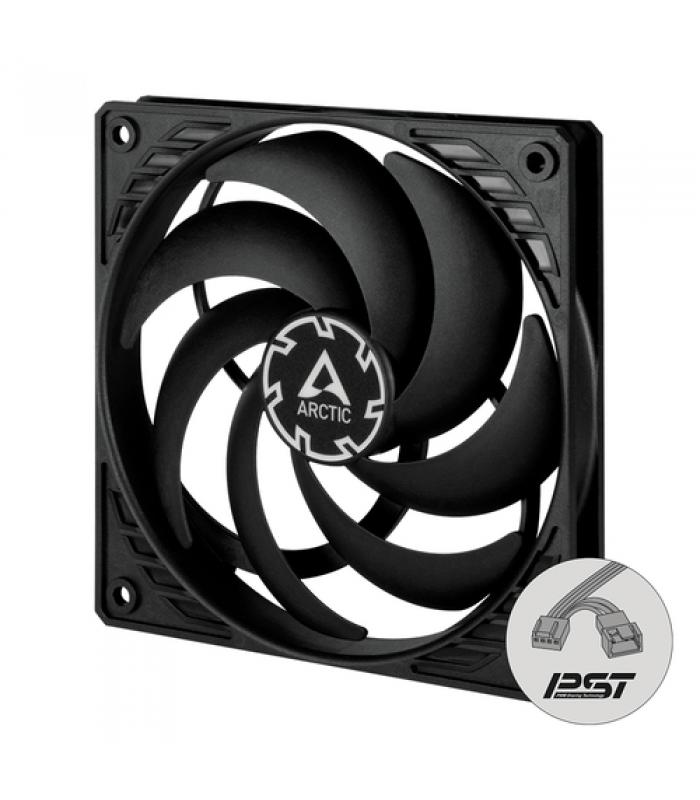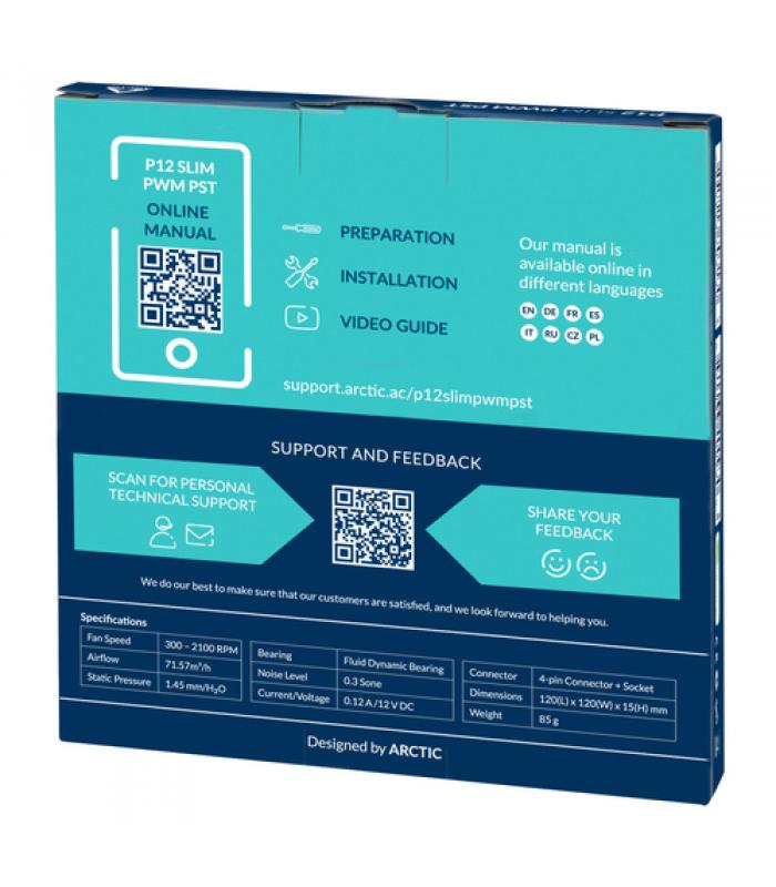 Con un amplio rango de velocidad y la innovadora tecnología PWM Sharing (PST), la velocidad del ventilador del P12 Slim PWM PST se puede controlar en sincronía con la de otros ventiladores. Los ventiladores PST de ARCTIC incorporan su propia solución de conexión en cadena y, además del conector, cuentan con otra toma para conectar uno o hasta cuatro ventiladores PST en serie.