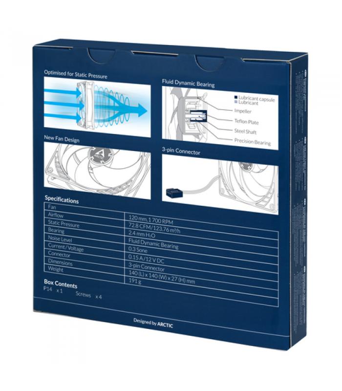 Durante el desarrollo del nuevo P14, se priorizó la concentración del flujo de aire y, por consiguiente, una alta presión estática. El ventilador garantiza una refrigeración extremadamente eficiente, incluso con mayor resistencia del aire. Por lo tanto, el P14 es especialmente adecuado para su uso en disipadores y radiadores.