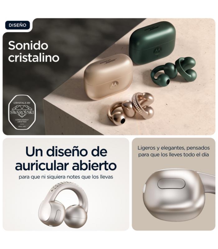 Presentamos los moto buds loop, unos auriculares elegantes y ligeros diseñados para mejorar tu experiencia de audio mientras te mantienes conectado con el mundo que te rodea. Con un diseño open-ear, moto buds loop ofrece la estética que buscas y la comodidad que deseas durante todo el día. Mantén el control de tu ajetreado día sin perder el ritmo cuando lo utilices con smartphones que tengan moto ai.(1) Escucha con una claridad y un equilibrio increíbles gracias a Sound by Bose. Experimenta llamadas nítidas con un sistema de micrófono avanzado. Y mantenlo protegido gracias a los materiales de primera calidad y a un diseño repelente al agua.(2) Con hasta 8 horas de batería ininterrumpida(3) y mucho más en el estuche, tienes toda la potencia que necesitas. moto buds loop siempre está en sintonía contigo.