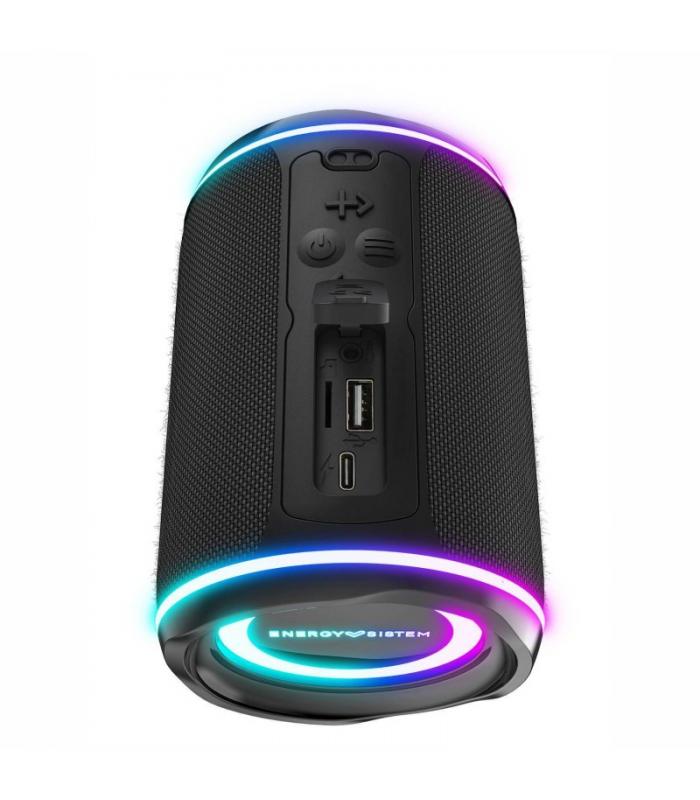Altavoz estéreo de 16 W con diferentes secuencias de luces RGB, tecnología Bluetooth 5.1 y True Wireless Stereo para utilizar dos unidades simultáneamente. Doble membrana de realce de bajos, reproductor MP3 por USB / microSD y audio-in.