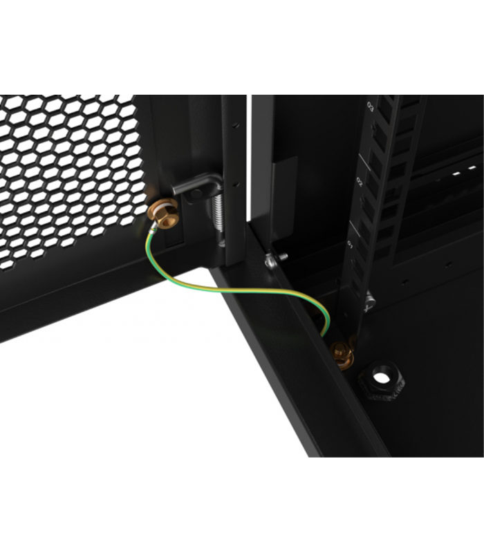 Fabricado en color negro, cuenta con puerta delantera perforada que favorece la ventilación del interior. Incluye bloqueo de teclado y rieles de rack con grosor de 1,5 mm para una instalación segura y resistente.