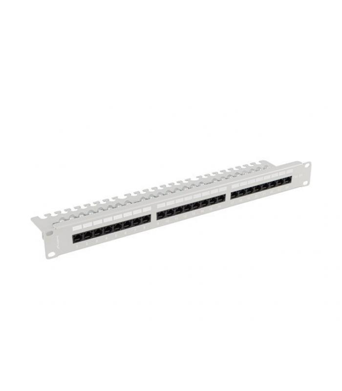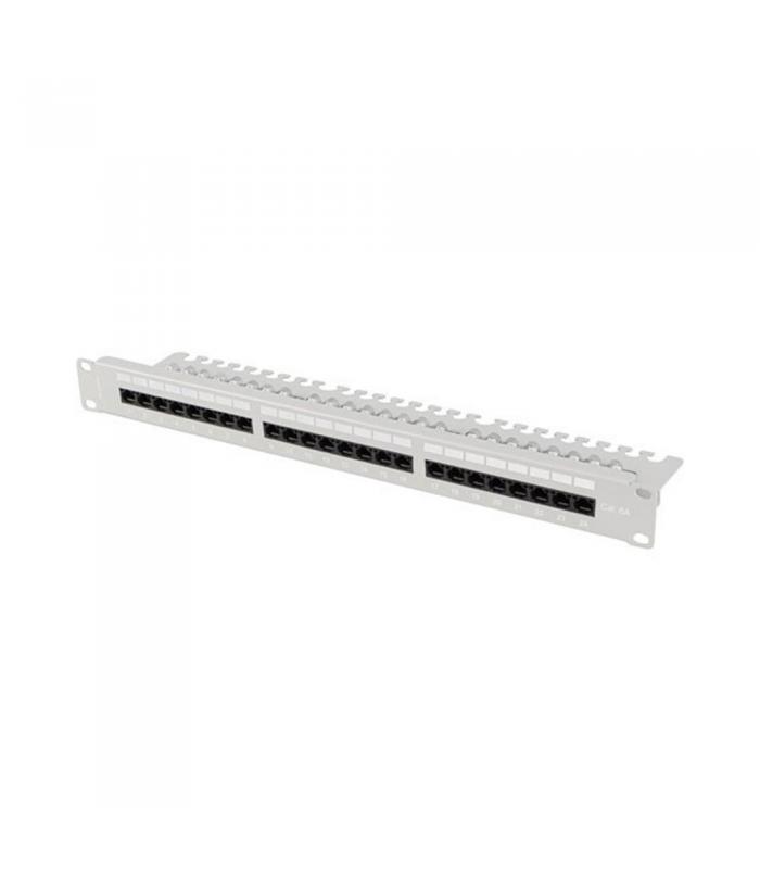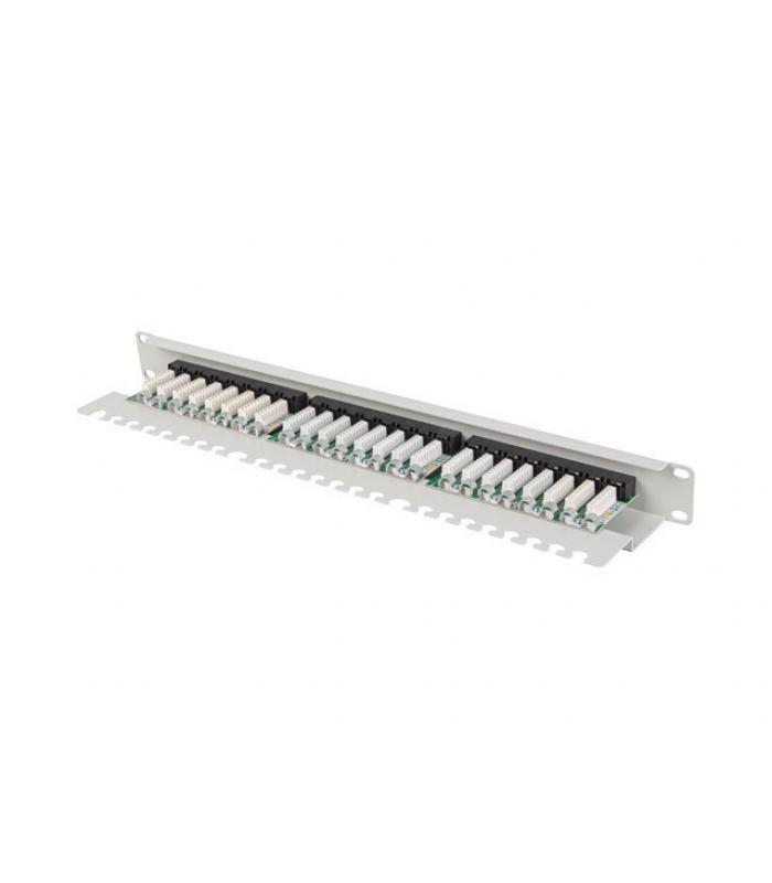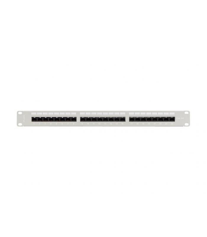 Panel de conexiones Lanberg para racks de 19" con 24 puertos UTP RJ-45 de categoría 6A. Equipado con conectores IDC/LSA compatibles con los estándares T568A y T568B. Fabricado en acero con acabado gris RAL7035. Incluye identificación numérica en cada puerto y espacios para descripción, facilitando la organización de la red.