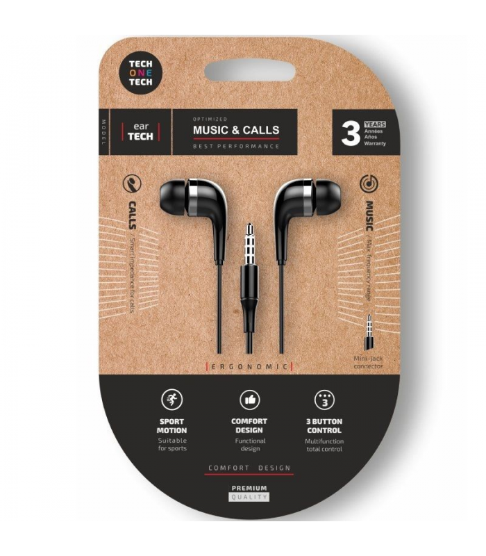 Auriculares soft earTECH ergonómicos, sonido estéreo, con micrófono, controles de volumen y tercer botón multifunción.