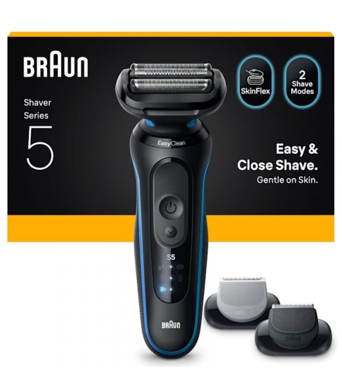 La afeitadora eléctrica Braun Series 5 ofrece un afeitado fácil y rápido. Las 3 cuchillas adaptables se adaptan cómodamente a los contornos de tu rostro. Los 2 modos de afeitado (modo Turbo y modo Estándar) le permiten ajustar el afeitado según sus necesidades. Lleva tu rutina de aseo al siguiente nivel con los accesorios Body Groomer y Beard Trimmer para un aseo y peinado versátiles. La batería de iones de litio ofrece hasta 50 minutos de funcionamiento inalámbrico y una carga rápida de 5 minutos. La afeitadora eléctrica de la Serie 5 para hombres es 100% resistente al agua.