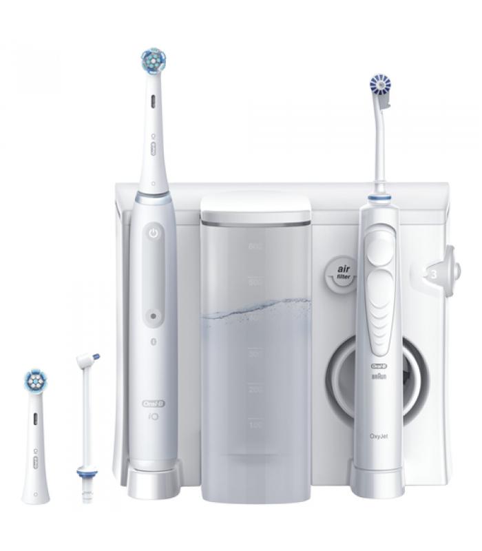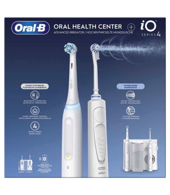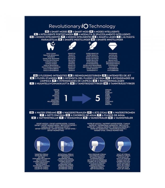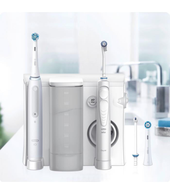 Gestión precisa y cómoda. Con su selector de 4 tipos de chorros, este irrigador agiliza y especializa el tratamiento de zonas interdentales, implantes y ortodoncia, ofreciendo una sensación de higiene profesional en cada uso. El mango iO4 y el cepillo de dientes eléctrico incorporan tecnología 3D que oscila, rota y pulsa, eliminando hasta un 100% más de placa comparado con los cepillos convencionales.