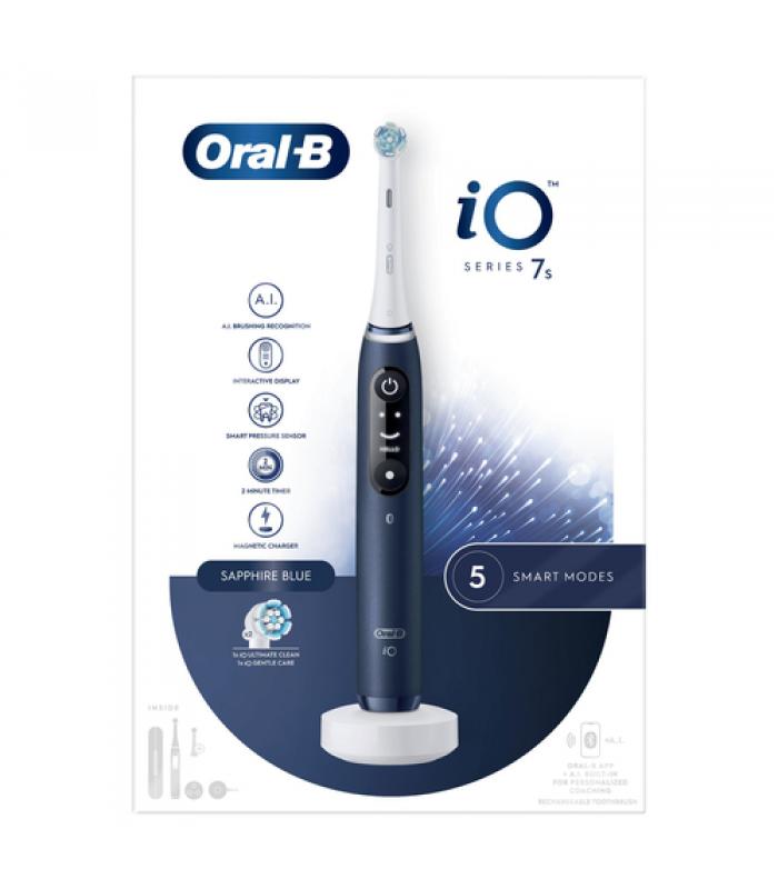 El cepillo de dientes eléctrico Oral-B Braun iO 7S es un dispositivo recargable que incluye dos cabezales. Ofrece cinco modos de cepillado: limpieza diaria, sensible, cuidado de las encías, intenso y blanqueamiento. Su tecnología de cepillado incluye un cabezal que oscila, rota y microvibra. Dispone de un sensor de presión que se ilumina en diferentes colores para indicar la presión adecuada durante el cepillado. La pantalla interactiva proporciona información sobre los modos de cepillado y un recordatorio para sustituir el cabezal. El tiempo de recarga es de tres horas y se incluye un cargador, una funda de viaje y un portarrecambios.