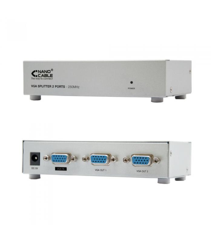 Duplicador SVGA para 2 monitores con fuente de alimentación.El duplicador SVGA de 2 Puertos permite que una sola fuente VGA pueda proporcionar imágenes en dos monitores simultáneamente. Perfecto para aulas, ferias, exposiciones, o exhibidores dentro de comercios donde se requiere alta calidad de vídeo en varios monitores. La simple operación plug and play facilita la configuración, por lo que este dispositivo se puede instalar y comenzar a utilizar en poco minutos.El duplicador soporta hasta 250 MHz de ancho de banda, proporcionando imágenes con resoluciones de hasta 1920x1440. Dispone de un circuito de amplificación de señal incorporado que permite visualizar imágenes a 65 metros de la fuente.Permite la conexión en cadena margarita.Puerto de entrada de señal: macho.
