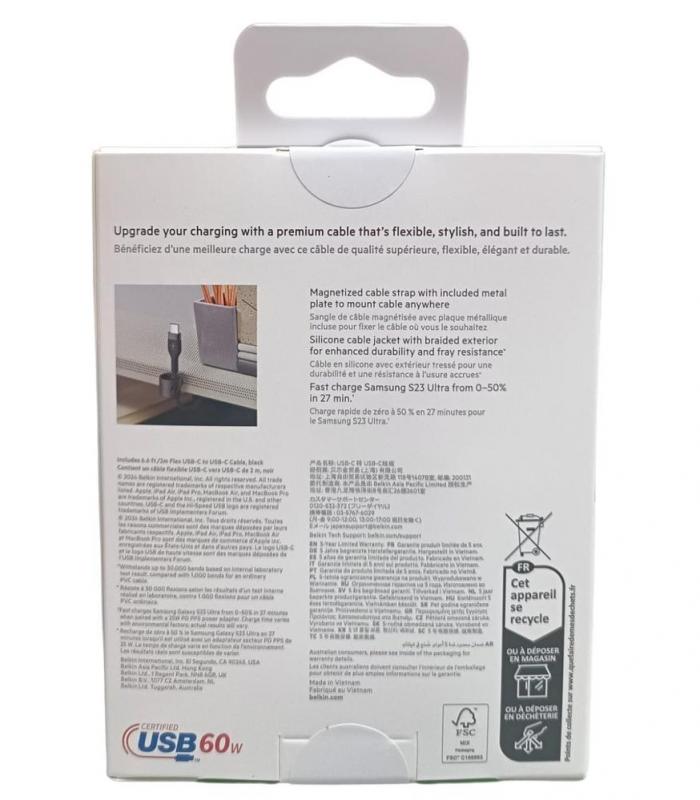 El **Belkin BoostCharge Pro Flex** es un cable USB-C a USB-C de alto rendimiento, pensado para quienes buscan una conexión fiable, duradera y rápida tanto para carga como para sincronización de datos. Gracias a su diseño reforzado con trenzado de nailon y a su capacidad de carga de hasta **100 W (USB Power Delivery)**, es ideal para acompañar dispositivos modernos como portátiles, tablets y smartphones con USB-C. Su longitud de **2 metros** ofrece la flexibilidad perfecta para usarlo en casa, la oficina o mientras viajas.