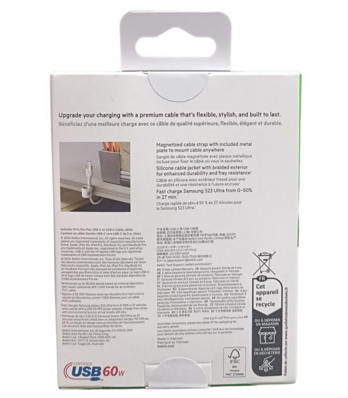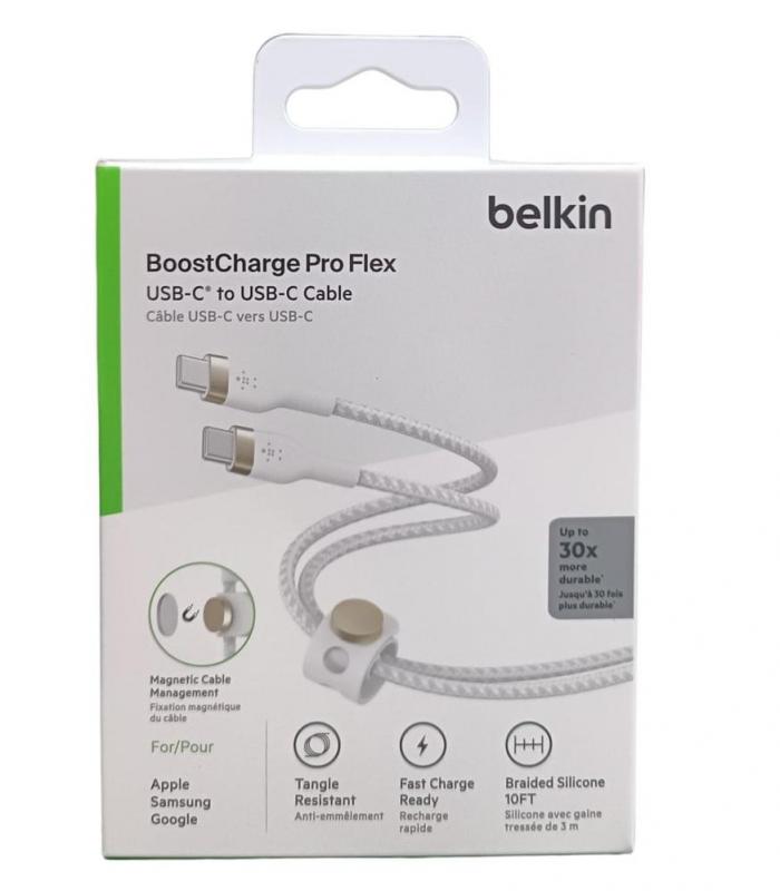 El **cable Belkin BoostCharge Pro Flex** es la solución ideal para quienes buscan un cable de carga y sincronización **resistente, duradero y de alta calidad**. Diseñado para acompañarte en el uso diario intensivo, este modelo de 3 metros te permite cargar y transferir datos de tus dispositivos USB-C con **total comodidad y libertad de movimiento**. Su recubrimiento trenzado y la garantía de 3 años lo convierten en una opción confiable y duradera para el hogar, la oficina o el coche.