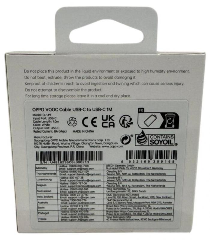 Características del OPPO Cable de Datos USB-C a USB-C 65W 1m Blanco