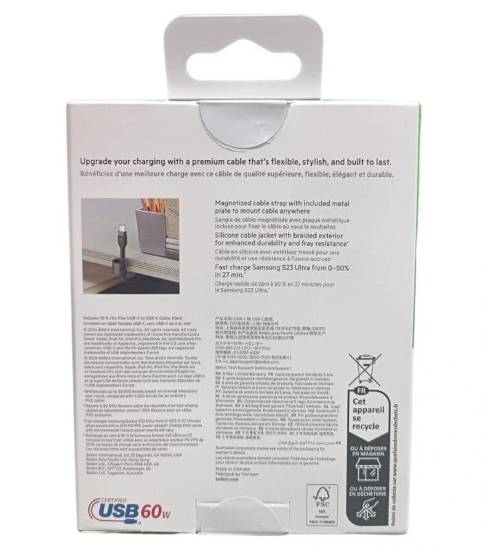 El **Belkin BoostCharge Pro Flex** es un cable USB-C a USB-C de alto rendimiento, diseñado para ofrecer una carga rápida y sincronización eficiente entre dispositivos compatibles. Con una longitud de **3 metros** y un acabado **trenzado ultraresistente**, este cable es ideal para quienes buscan durabilidad, libertad de movimiento y fiabilidad en el uso diario. Perfecto para usuarios de portátiles, smartphones, tablets y otros dispositivos USB-C.