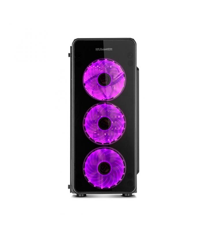 Una semitorre fabricada en acero con paneles de cristal templado que cumple las expectativas de aquellos que buscan personalidad y rendimiento en su equipo. Hummer TGM incorpora en su panel superior dos puertos USB 2.0, un puerto USB 3.0 y las conexiones de audio. Además incluye un botón para controlar los modos de iluminación ARGB.