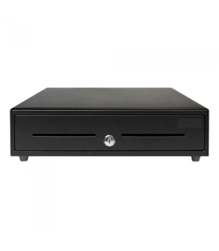 Este modelo combina una construcción resistente en acero con un formato compacto, adaptándose a mostradores con espacio limitado sin sacrificar capacidad. Su cerradura con tres posiciones permite elegir entre cerrado, abierto o espera de apertura automática mediante impresora.