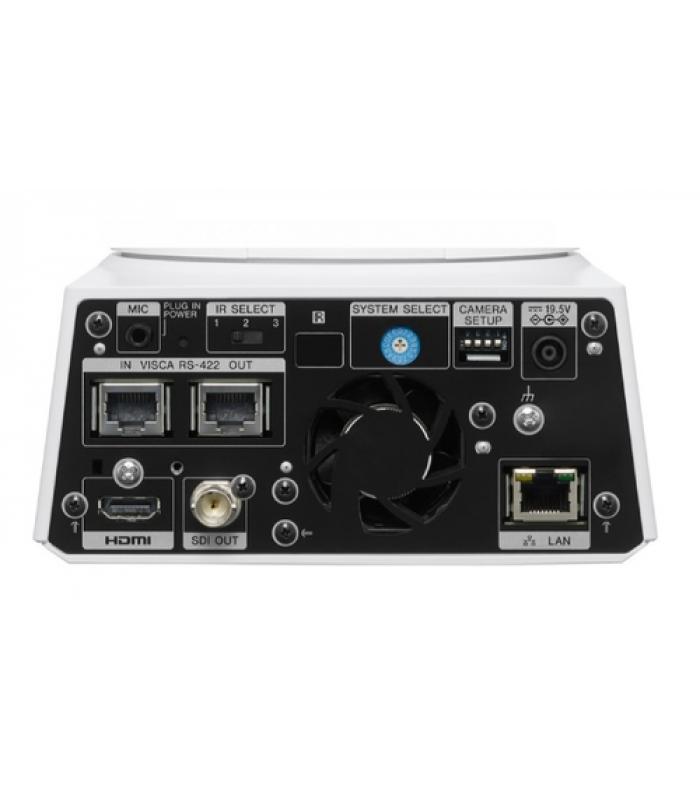 Diseñada para integrarse en flujos de trabajo AV profesionales, la cámara incorpora salidas HDMI, 3G-SDI y conexión LAN compatible con PoE+. Además, cuenta con entrada y salida VISCA sobre IP, conexión de micrófono y compatibilidad con protocolos de transmisión en red como RTSP, SRT y NDI|HX.