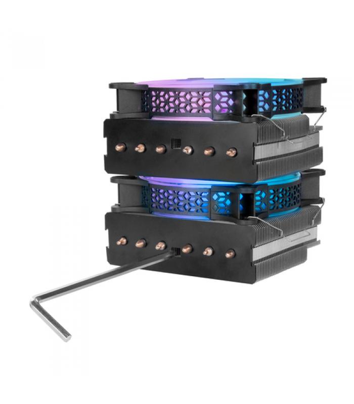 | Caracteristicas | - TDP: 300W - Socket: INTEL LGA 2066/ 2011/ 1700/ 1200/ 1156/ 1155/ 1151/ 1150/ 1366 AMD AM5/ AM4/ AM3+/ AM3/ AM2+/ AM2/ FM2/ FM1 - Ventilador: 120x25mm - Flujo de aire: 31-72 CFM - Nivel sonoro: 9-26 dBA - Velocidad: 800-1600 ± 10% RPM - Potencia máx.: 6 W - Vida útil: 60.000 horas - Rodamientos: Hidráulico - Conexión: PWM 4pin / +5V Addressable RGB 3 pin (control placa base) - Nº de heatpipes: 6 - Pasta térmica - Voltaje: 12VDC - Corriente: 0.5A - Altura CPU cooler: 145mm - Presión aire: 0.79-1.31 mm-H2O - Iluminación: ARGB - Material: Base de cobre, aletas de aluminio - Dimensiones: 134 x 132 x 145 mm - Peso: 873 g |