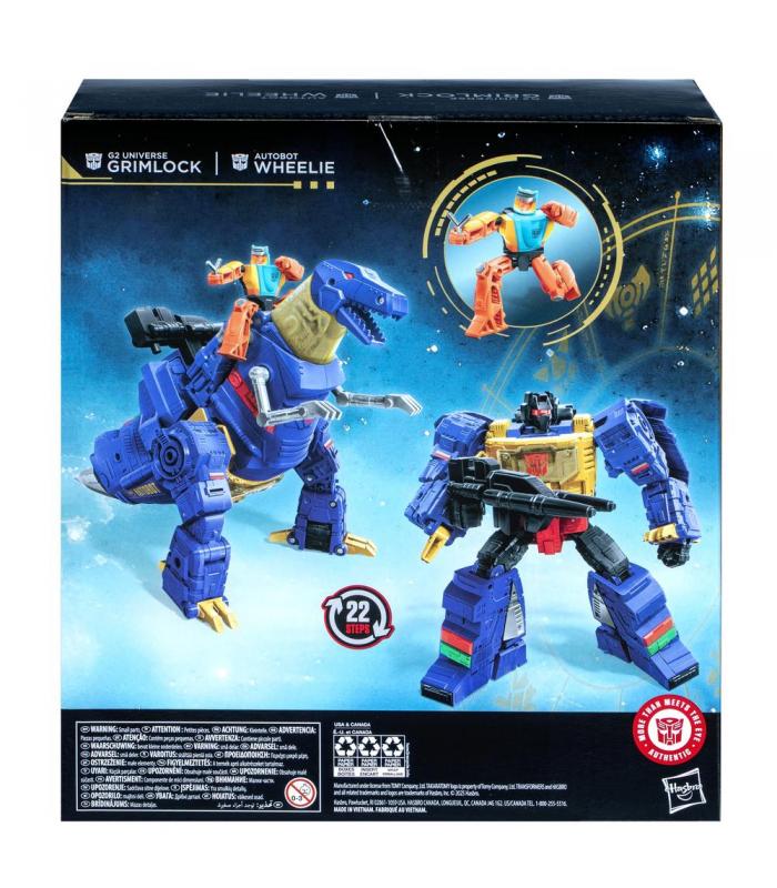 figura G2 Universe Grimlock de 19 cm cambia de robot a dinosaurio en 22 pasos. Equípate para la batalla con el cañón bláster incluido. La figura de G2 Universe Grimlock está inspirada en el personaje