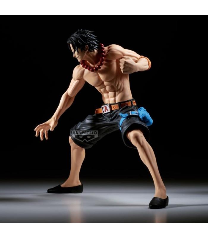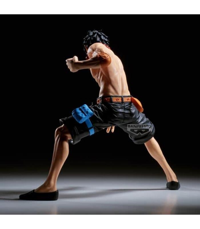 La figura reproduce fielmente a Ace, comandante de la 2.ª división de los Piratas de Barbablanca, con un esculpido minucioso que resalta cada rasgo: desde su musculatura hasta los tatuajes y su icónico sombrero. La posición transmite energía y captura su personalidad ardiente, inspirada en el poder de la **Fruta Mera Mera**.