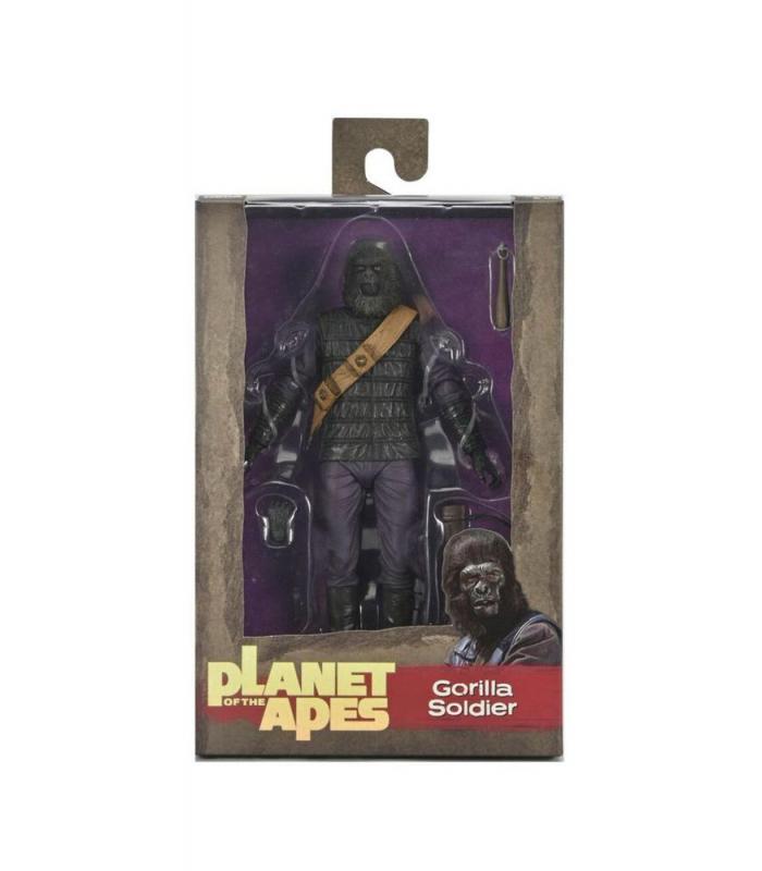 Neca presenta la figura de Gorilla Soldier. Mide 18 cm y está basada en el personaje de la pelÃcula de 1968 ""Planet of the Apes"" (""El planeta de los simios"" en España). Incluye 1x bláster, 1x mano alternativa y 1x porra. Se presenta en una caja con ventana.