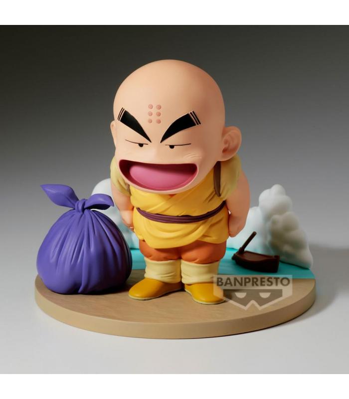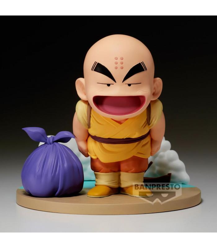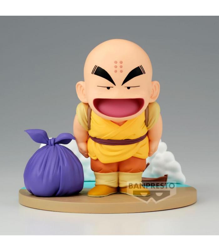 Krillin aparece con su icónico traje de combate del Templo de Kamisama, con expresión decidida y lista para la acción. El esculpido detalla su musculatura, vestimenta y cicatriz en la frente, con una pintura que resalta su estilo retro fiel al anime original.