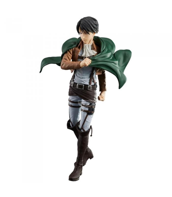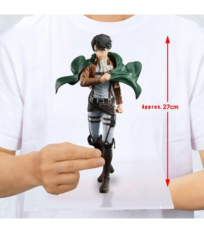 Levi aparece con su uniforme completo del Cuerpo de Exploración, capa incluida, en una postura sobria que transmite autoridad y control. Su rostro serio y su mirada penetrante están esculpidos con gran precisión. El modelado incluye detalles como las correas, el equipo de combate y el movimiento natural del cabello, reflejando fielmente el estilo del anime.