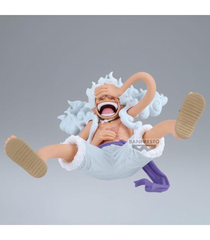Escultura con gran nivel de detalle que captura la expresividad exagerada y el dinamismo característico del Gear 5. Luffy aparece con el cabello blanco ondulante, ojos brillantes, sonrisa desbordante y vestimenta en movimiento. La figura transmite una mezcla de fuerza, locura y diversión, fiel al estilo único de esta transformación.
