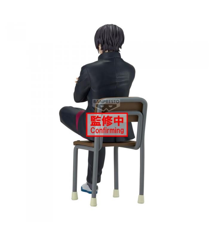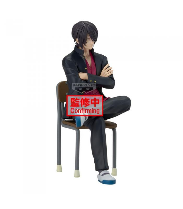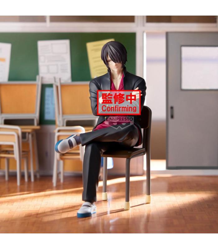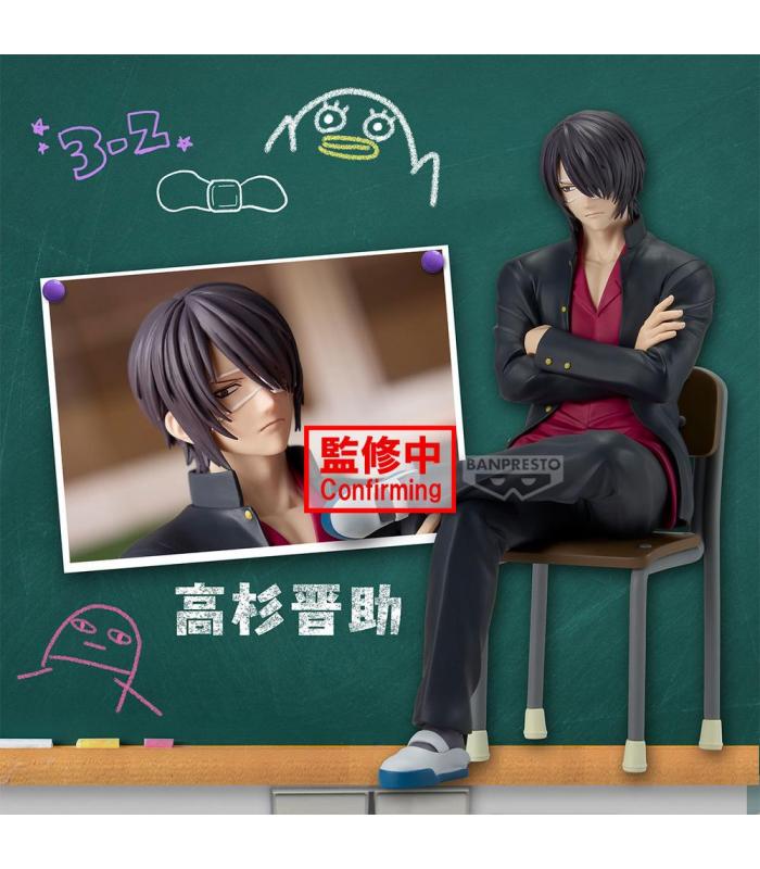 Figura de escritorio de Shinsuke Takasugi, personaje del anime *Gintama*, perteneciente a la serie “Mr. Ginpachi’s Zany Class”. Presentado en estilo chibi con uniforme escolar, sentado de forma desenfadada sobre un pupitre, con expresión desafiante y postura relajada, fiel al tono humorístico de esta línea de figuras.