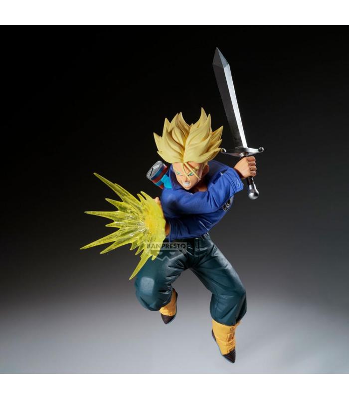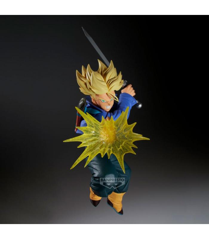 Escultura dinámica con efectos especiales translúcidos que simulan el estallido de energía. Trunks aparece con su chaqueta Capsule Corp, espada enfundada y rostro concentrado. La figura destaca por su intensidad visual y fidelidad al estilo del anime.