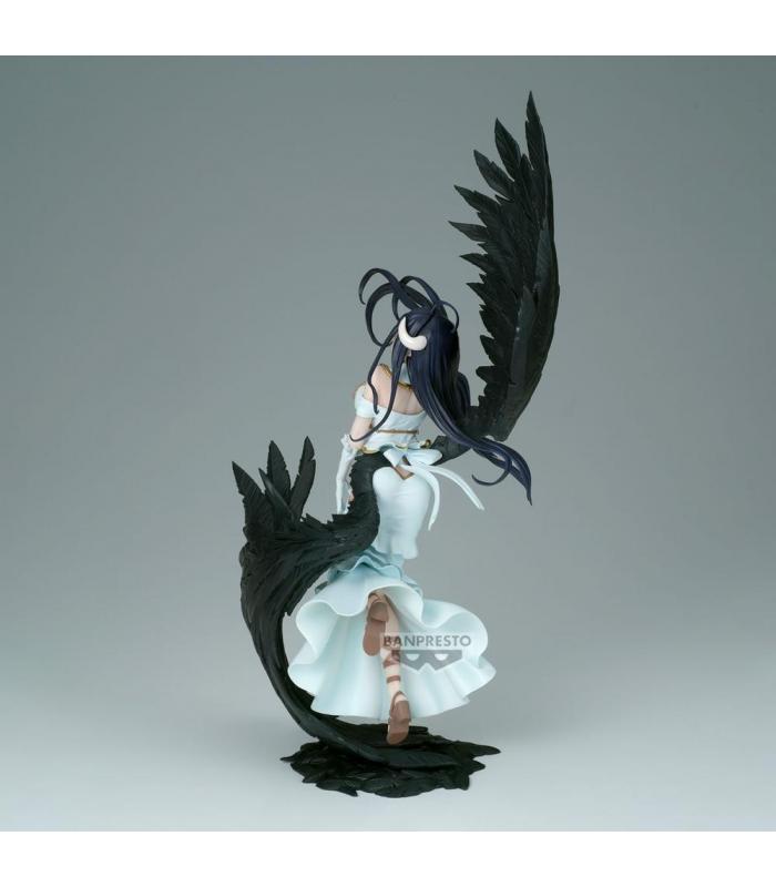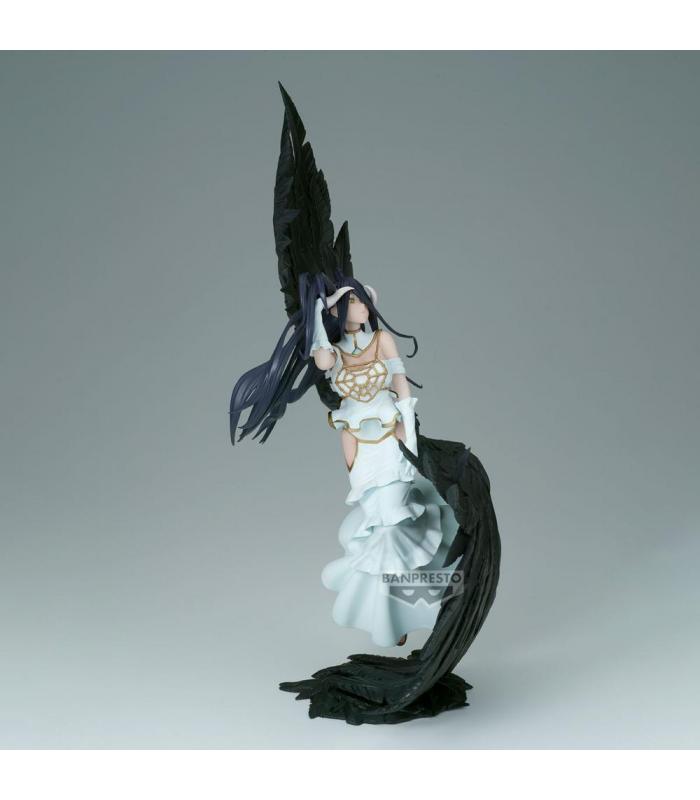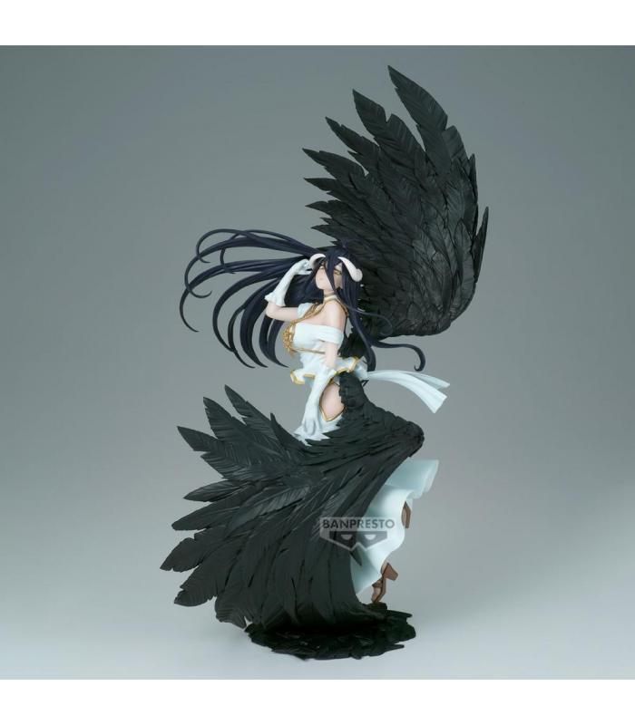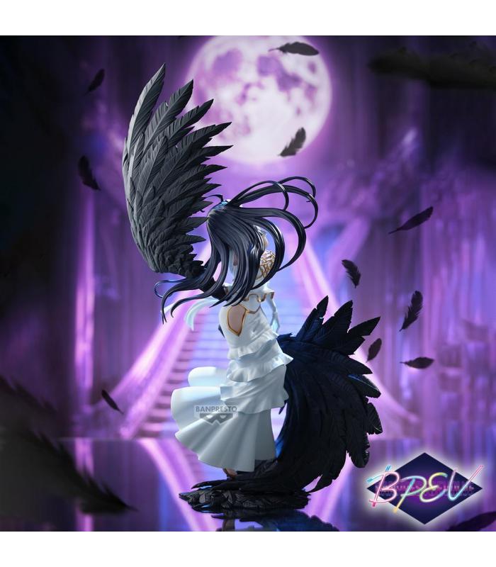 Figura de Albedo, la carismática Emperatriz de la Oscuridad del anime Overlord, perteneciente a la línea Banpresto Evolve. Presenta al personaje en una elegante pose con su vestido blanco y alas negras desplegadas, capturando toda su belleza y presencia imponente.