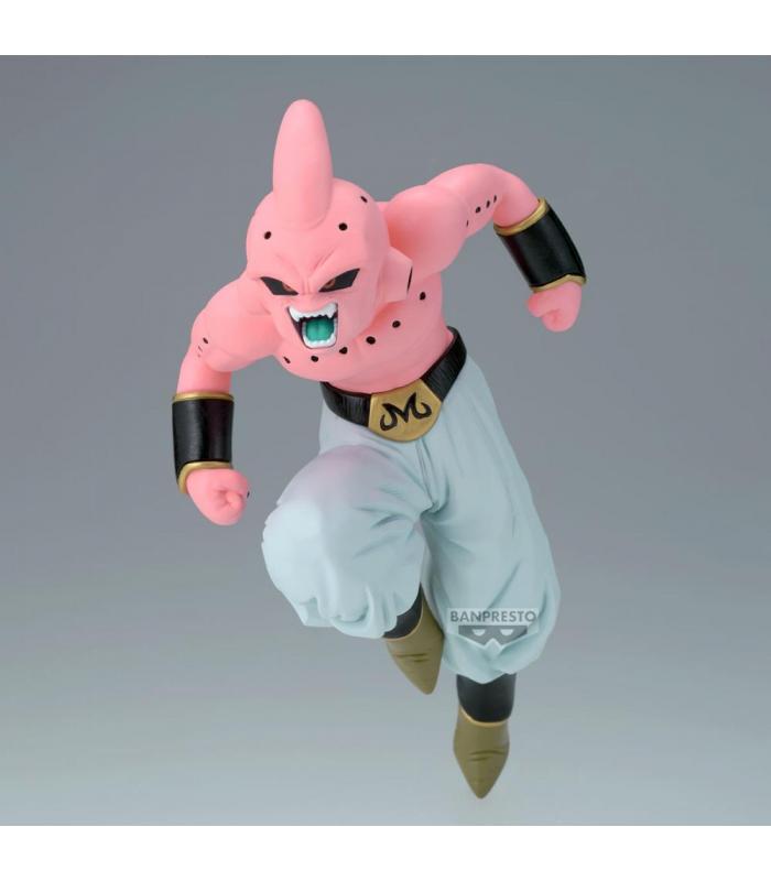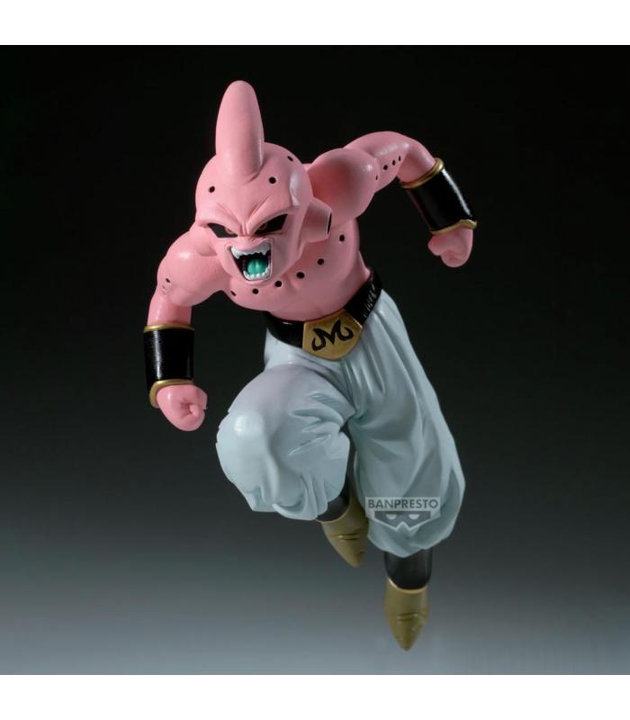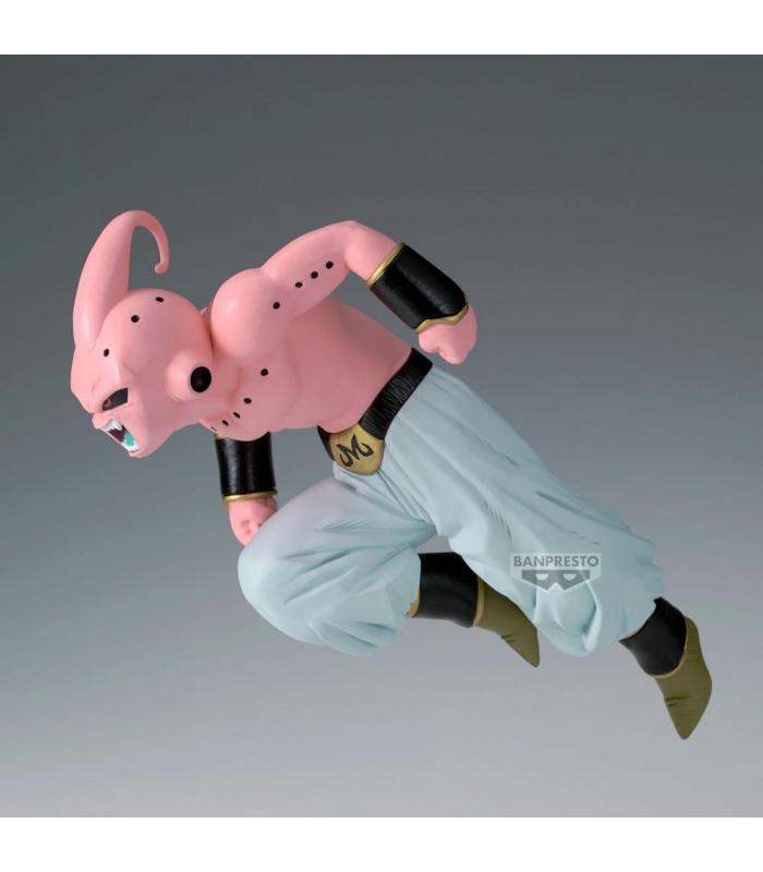 Escultura dinámica que muestra a Majin Buu en posición de combate, con expresión agresiva, cuerpo compacto y musculado, y detalles característicos como el pantalón blanco y los brazaletes dorados. La figura refleja perfectamente su naturaleza caótica y brutal.