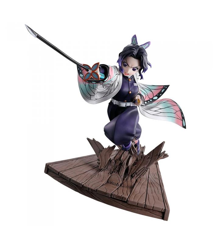 Cada detalle ha sido cuidadosamente esculpido y pintado para reflejar la esencia de Shinobu Kocho: desde su haori con motivos de mariposa hasta la expresión calmada en su rostro y su pose estilizada. La combinación de colores vibrantes y el sombreado preciso resaltan los patrones y texturas de su vestimenta con gran realismo.