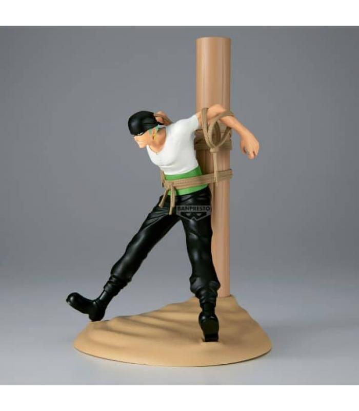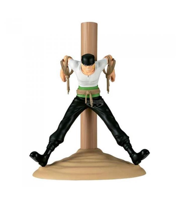 Zoro está esculpido en una pose de combate que captura perfectamente su carácter decidido y su estilo de lucha único. Cada detalle, desde sus espadas hasta su expresión facial, ha sido trabajado con precisión para ofrecer una figura de gran impacto visual.