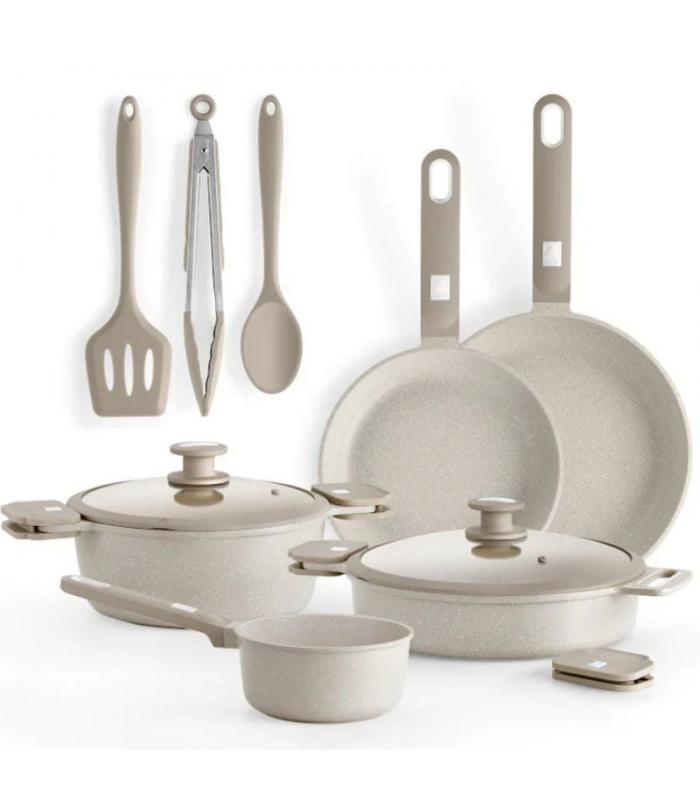 La batería incluye todo lo necesario para equipar la cocina de los cocineros más exigentes. Las sartenes, el cazo y las cacerolas son muy funcionales y perfectas para su uso diario. Su fondo difusor las hace aptas para todas las cocinas, incluidas las de inducción. Las cacerolas se pueden usar también en el horno, sin las asas de silicona y sin la tapa.