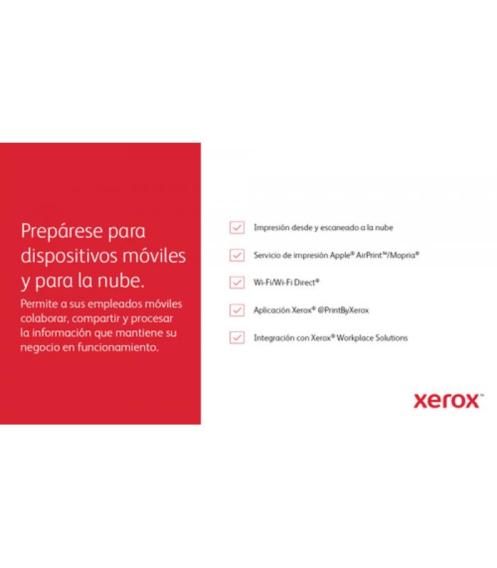 La VersaLink C415V_DN incluye opciones de conectividad completas, con **Gigabit LAN, USB 2.0, host USB y NFC**, además de compatibilidad con **AirPrint**, facilitando la impresión desde dispositivos móviles. Sus funciones de escaneado a servicios en la nube, carpetas de red o USB ofrecen una integración fluida en entornos colaborativos.