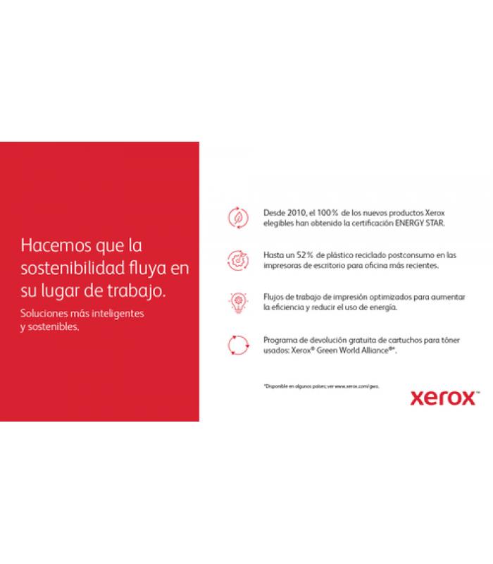 La impresora cuenta con certificación **ENERGY STAR**, lo que garantiza un consumo eficiente sin comprometer el rendimiento.Además, es compatible con el programa **Xerox Green World Alliance** para la gestión responsable de consumibles.
