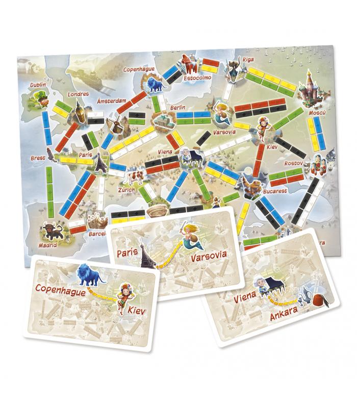 1 tablero con el mapa de europa - 80 piezas de tren - 72 cartas de tren - 32