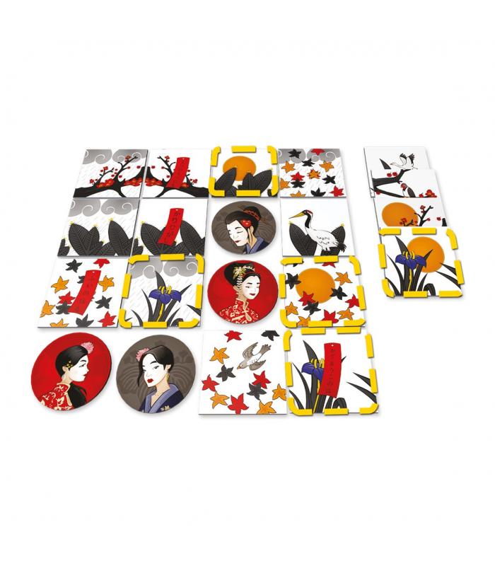 8 fichas de geisha para el jugador rojo - 8 fichas de geisha para el jugador negro - 16 losetas de jardín imperíal.