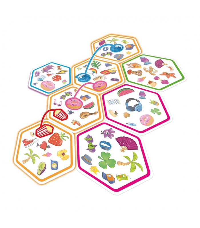 Dobble connect contiene 90 cartas con 10 símbolos en cada una y más de 91 símbolos en total. solamente hay 1 símbolo idéntico entre cada 2 cartas. ¡a buscar!