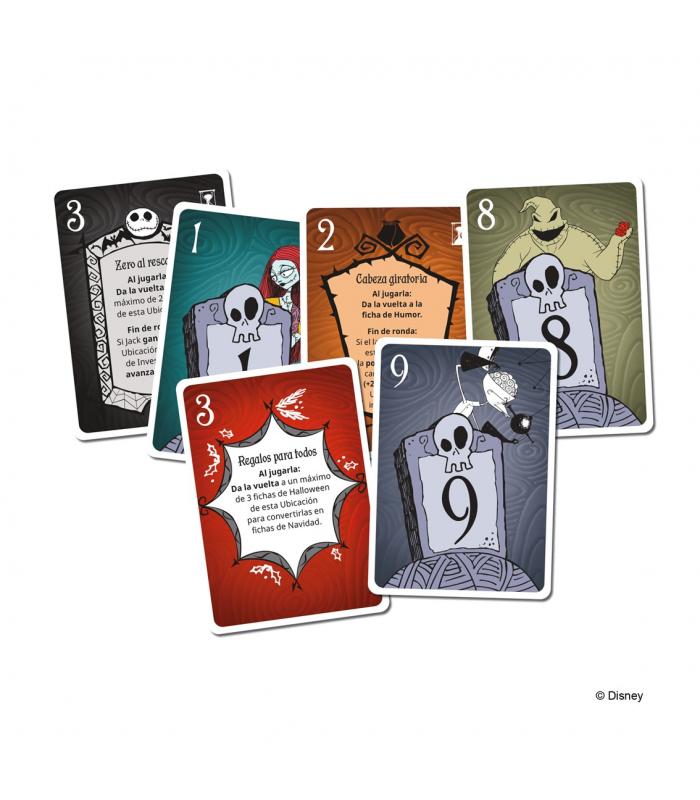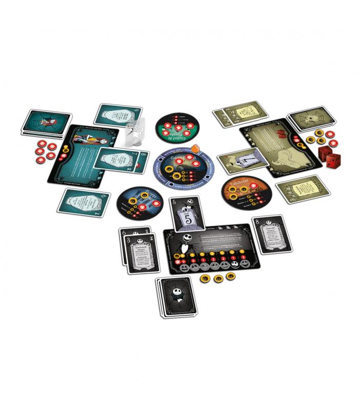 6 tableros de personaje - 126 cartas de personaje - 12 cartas de ubicación - 1 carta de ubicación central - 136 fichas de fiesta de doble cara - 2 dados de oogie boogie - 1 ficha de humor del alcalde - 1 ficha