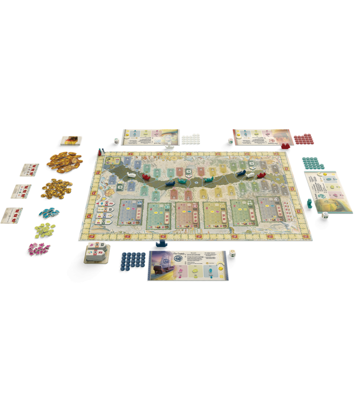 en cada turno - tu tirada presenta tres oportunidades únicas - pero solo puedes elegir una: hacer crecer tu imperio comercial erigiendo construcciónes a lo largo de las orillas del río - zarpar río abajo para