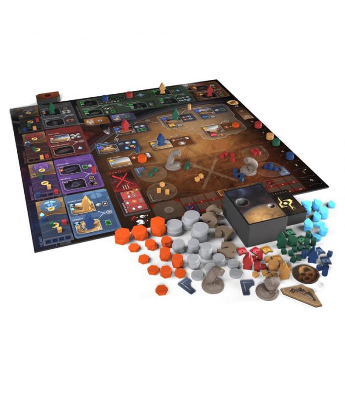 tablero de juego de doble cara - 12 agentes de madera - 95+ piezas de madera para jugadores - 75+ fichas de madera para recursos - 4 miniaturas de gusano de arena - 250+ cartas - 9 líderes - 60+ fichas