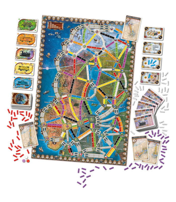 1 tablero de Europa del Norte, 200 Vagones de tren de colores, 114 cartas de Vagón, 55 cartas de Billete de Destino, 11 cartas de Objetivo común, 5 Marcadores de Puntuación, 1 Libro de reglas