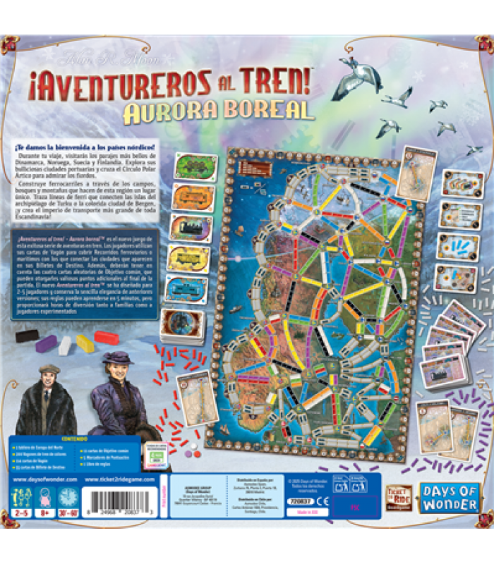 ¡Aventureros al tren! - Aurora boreal™ es el nuevo juego de esta exitosa serie de aventuras en tren. Los jugadores utilizan sus cartas de Vagón para cubrir Recorridos ferroviarios o marítimos con los que conectar las ciudades que aparecen en sus Billetes de Destino. Además, deberán tener en cuenta las cuatro cartas aleatorias de Objetivo común, que pueden otorgarles valiosos puntos adicionales al final de la partida. El nuevo Aventureros al tren™ se ha diseñado para 2-5 jugadores y conserva la sencilla elegancia de anteriores versiones, sus reglas pueden aprenderse en 5 minutos, pero proporcionará horas de diversión tanto a familias como a jugadores experimentados.