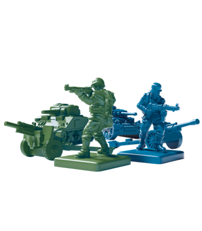 1 tablero de doble cara, 144 miniaturas de ejército (Eje y Aliados), 36 obstáculos, 44 hexágonos de Terreno de
