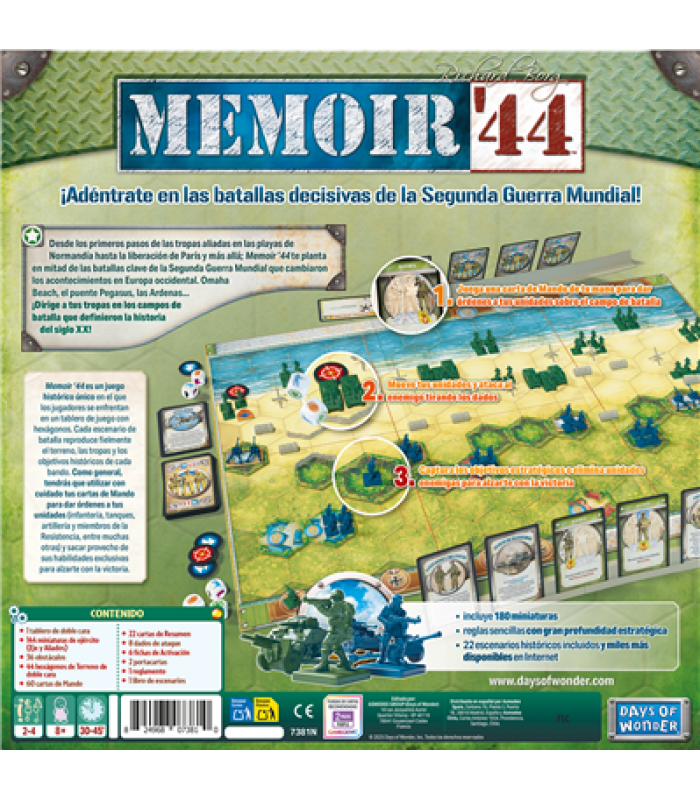 Desde los primeros pasos de las tropas aliadas en las playas de Normandía hasta la liberación de París y más allá, Memoir ’44 te planta en mitad de las batallas clave de la Segunda Guerra Mundial que cambiaron los acontecimientos en Europa occidental. Omaha Beach, el puente Pegasus, las Ardenas... ¡Dirige a tus tropas en los campos de batalla que definieron la historia del siglo XX!