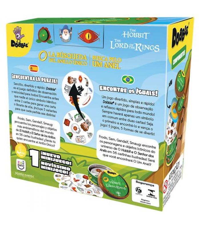 El clásico juego de observación y velocidad Dobble® se adentra en la Tierra Media con esta versión especial inspirada en El Señor de los Anillos. En Dobble The Lord of the Rings, los jugadores deberán encontrar antes que nadie el símbolo idéntico entre dos cartas, ahora con los personajes, objetos y emblemas más icónicos de la saga. Rápido, sencillo y adictivo, es el juego perfecto para toda la familia y para los fans del universo de Tolkien.