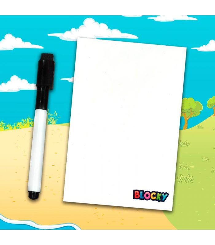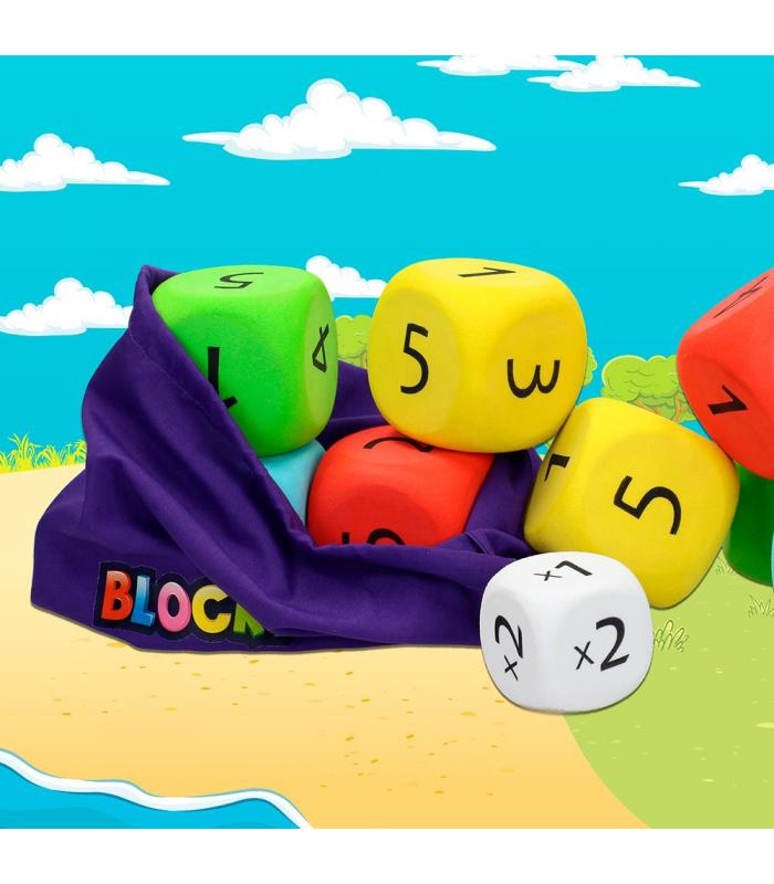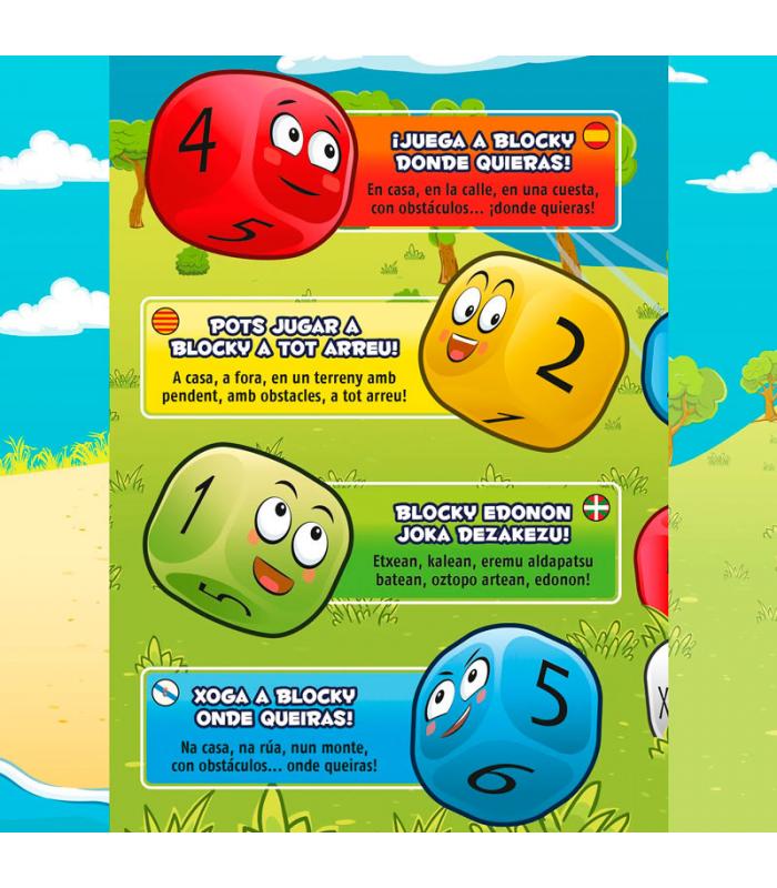Blocky, el juego para toda la familia, ¡lo puedes jugar en cualquier sitio!En casa, al aire libre, en un terreno inclinado, con obstáculos... ¡en todas partes!El primero en conseguir 40 puntos, gana la partida.Componentes-9 dados gigantes-1 pizarra-1 rotulador borrable-1 bolsa de transporte-1 reglamento
