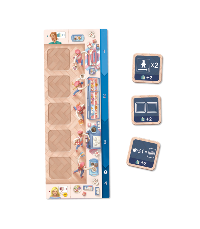Os damos la bienvenida de nuevo. Vuestra cafetería se está expandiendo y las riquísimas bebidas que servís ya no os parecían suficiente, asa que ahora también ofrecéis tartas con las que queréis hacer aún más felices a vuestros clientes. Contratad personal y utilizad sus habilidades para sobrevivir al ajetreo.