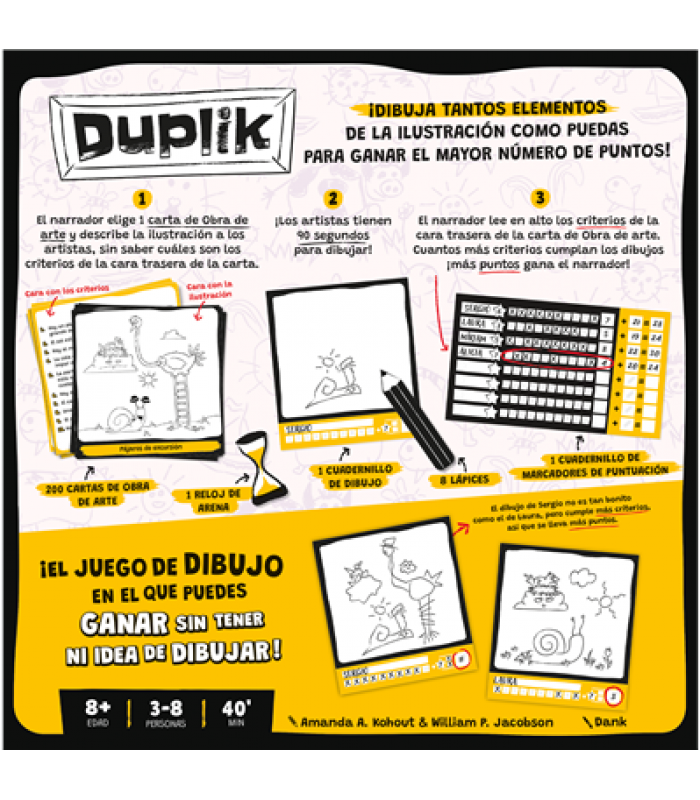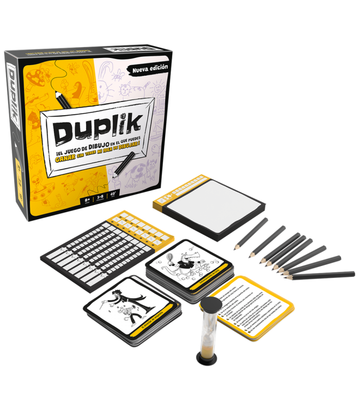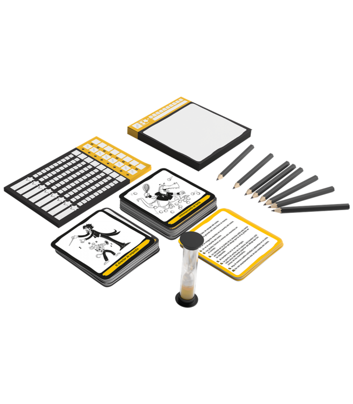 200 cartas de Obra de arte, 8 lápices, 1 cuadernillo de dibujo, 1 cuadernillo de marcadores de puntuación, 1 reloj de arena de 90 segundos